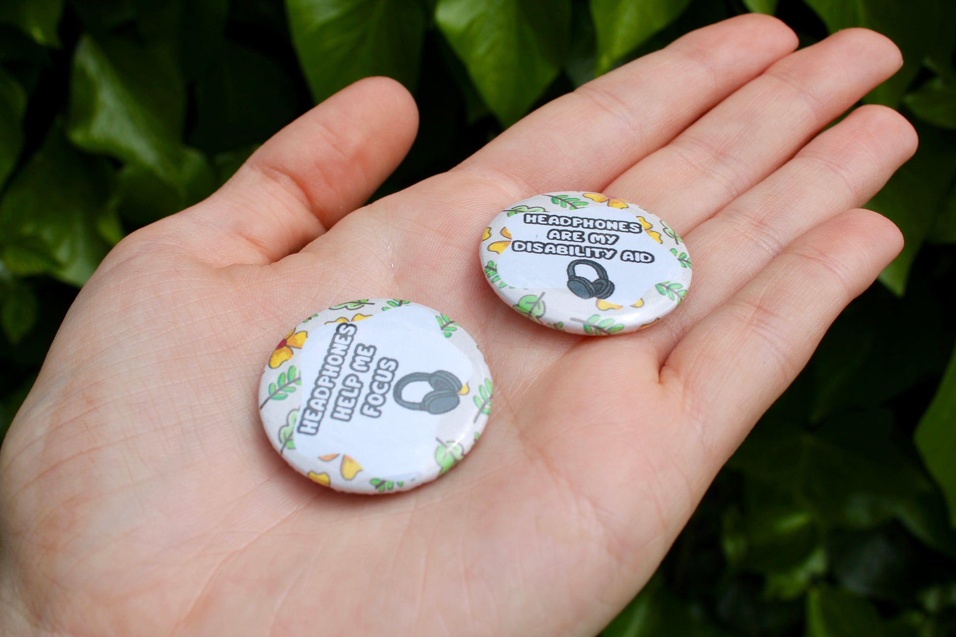 32mm Headphone themed non-verbal communication pin badges
