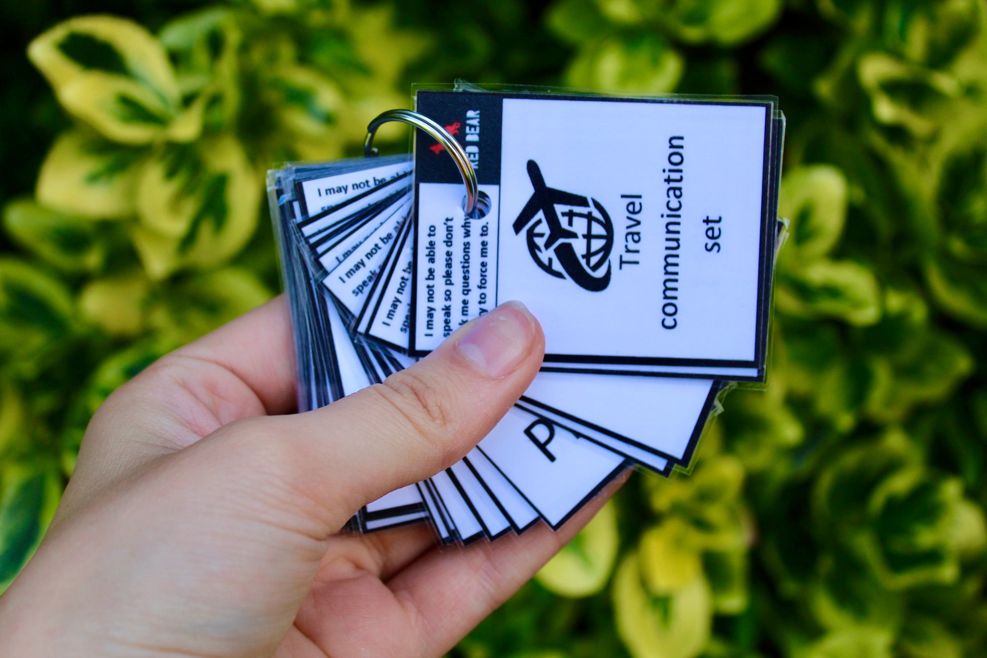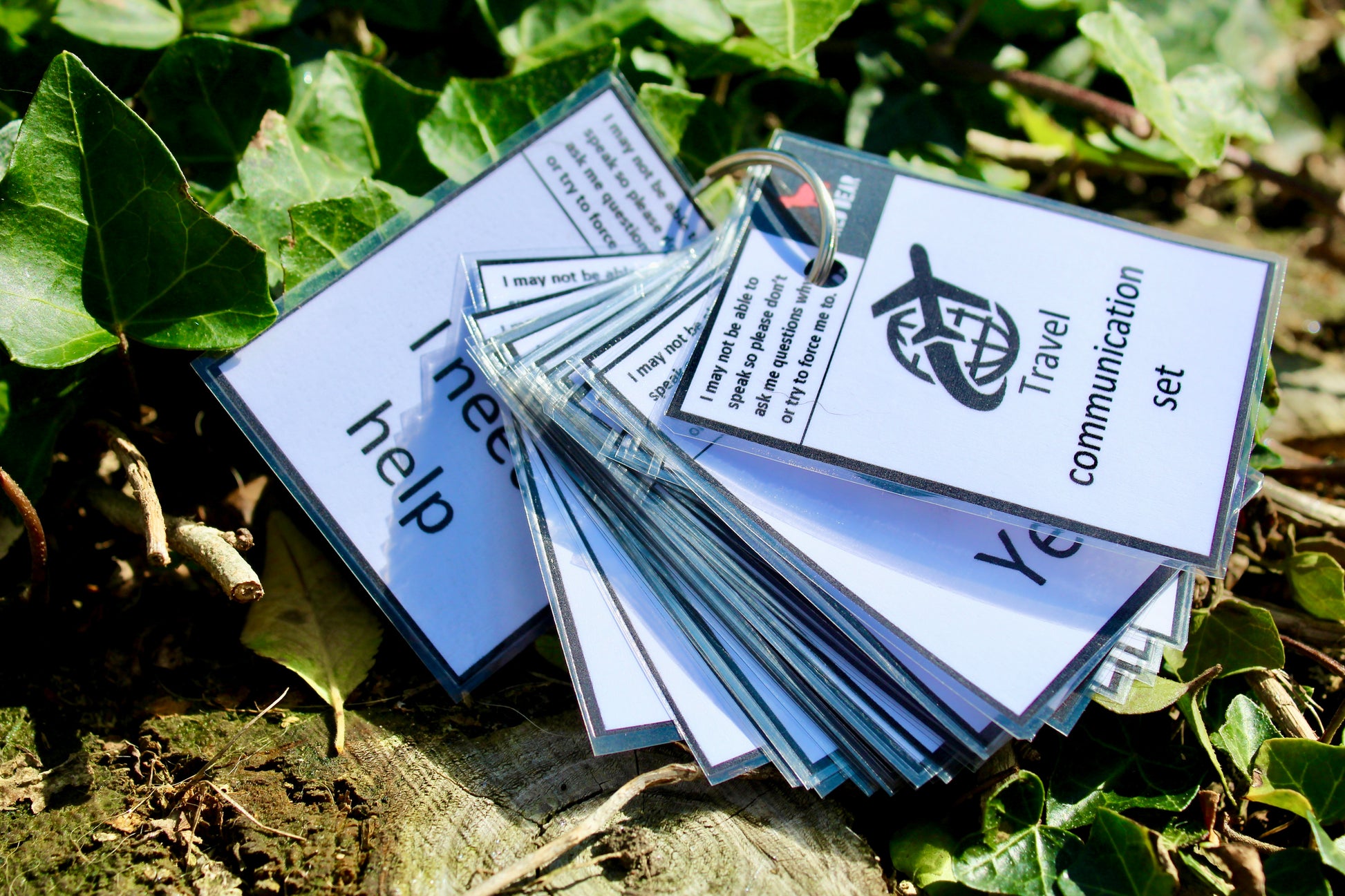 This thirty-two-piece card set explains that the holder of the cards may be non-verbal or struggle to communicate their needs. This communication set allows them to tell others what they might need or how they feel in the event of them not being able to express themselves verbally. They allow the holder to explain their needs in a simple and quick format for others to understand within a travel setting.