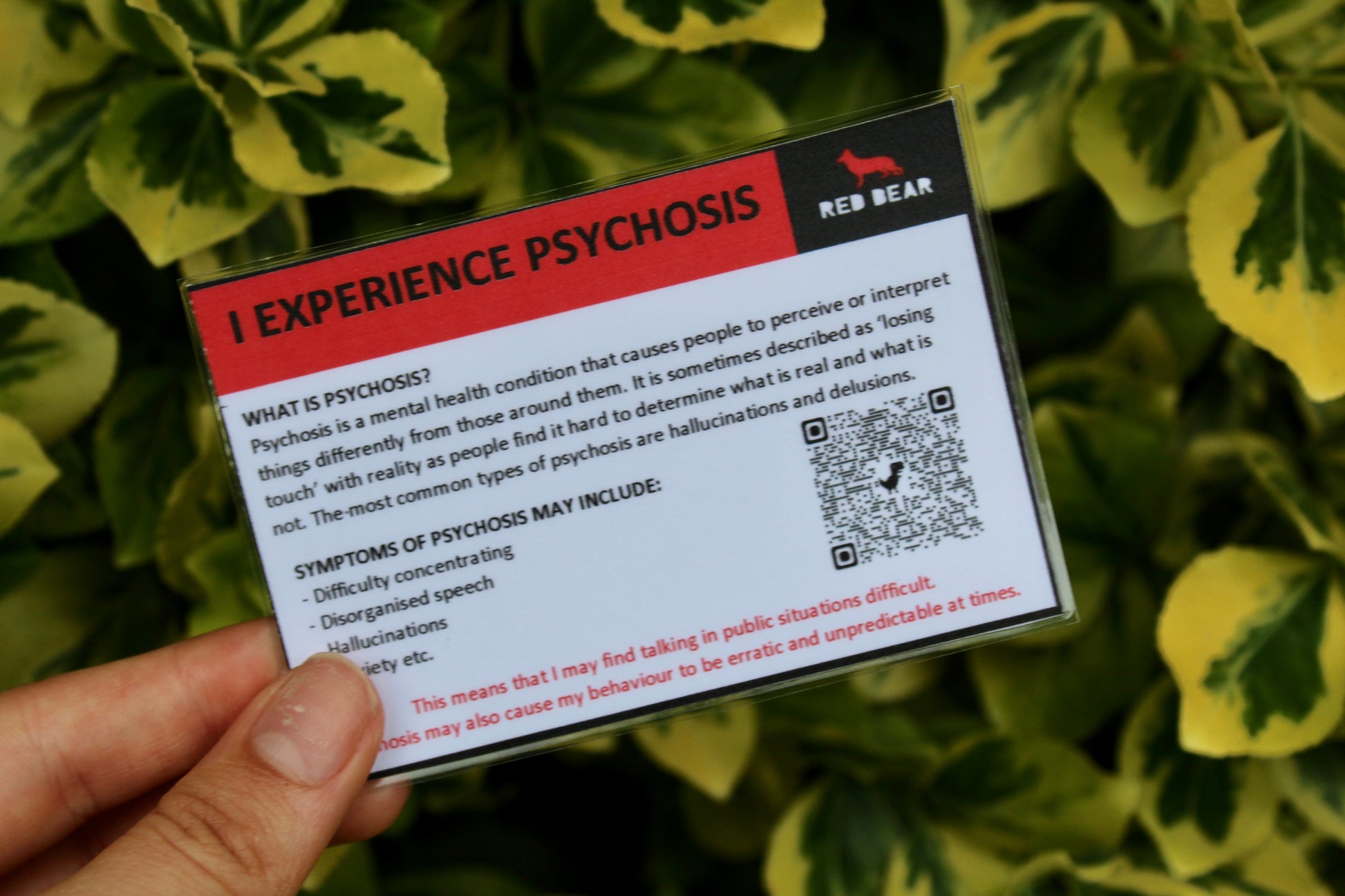 This "I experience psychosis" card explains that the handler has a medical condition which means that they experience psychosis. It explains what psychosis is and some symptoms.