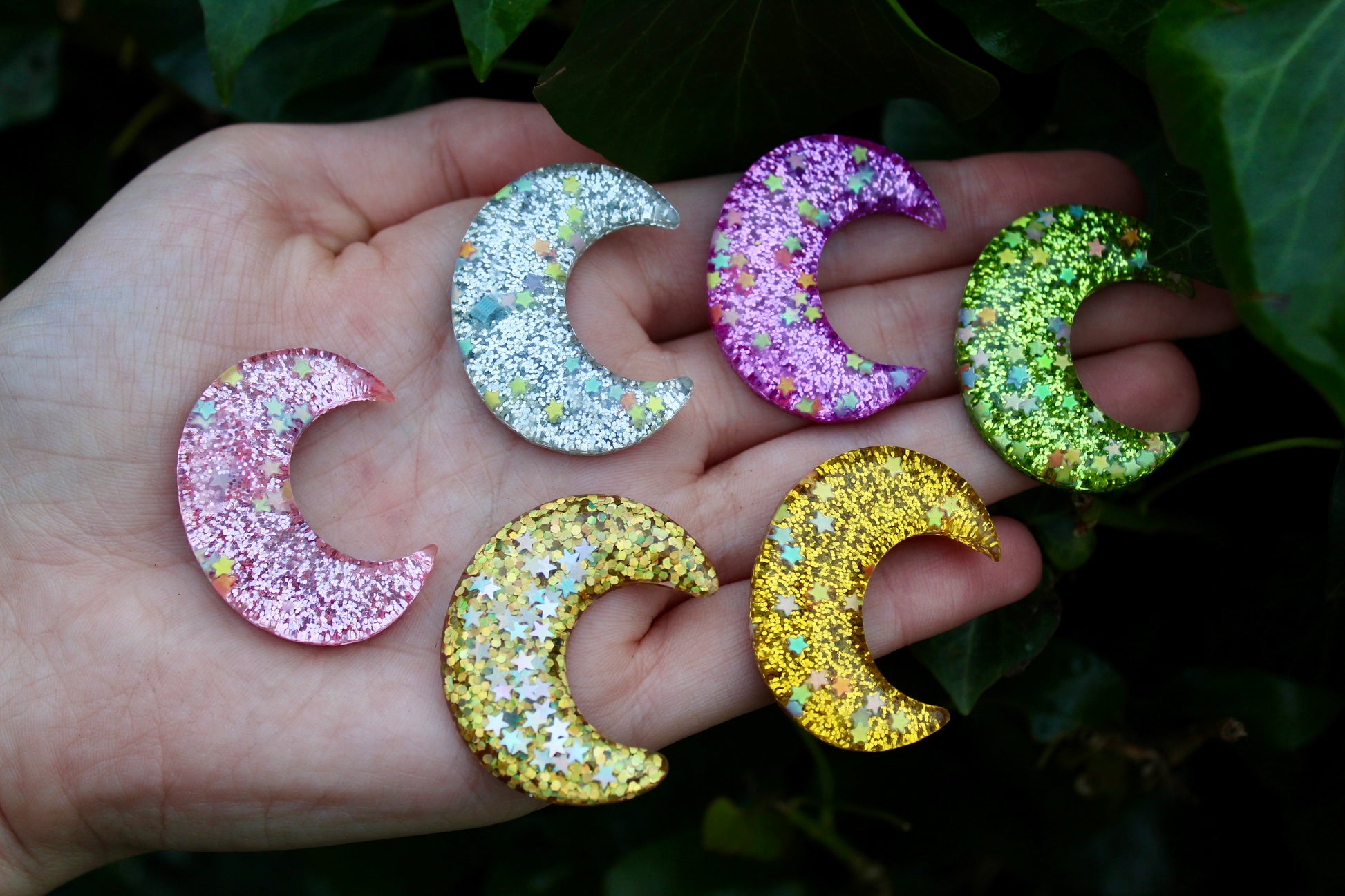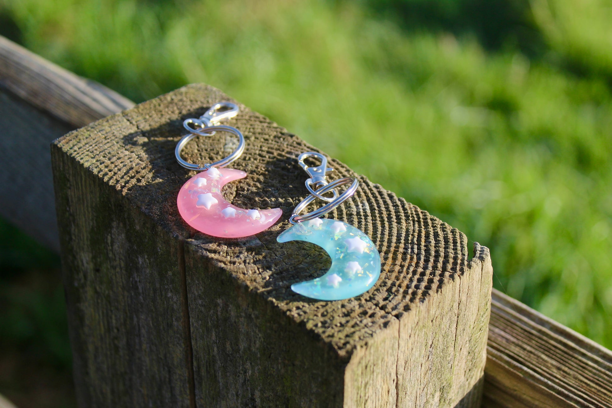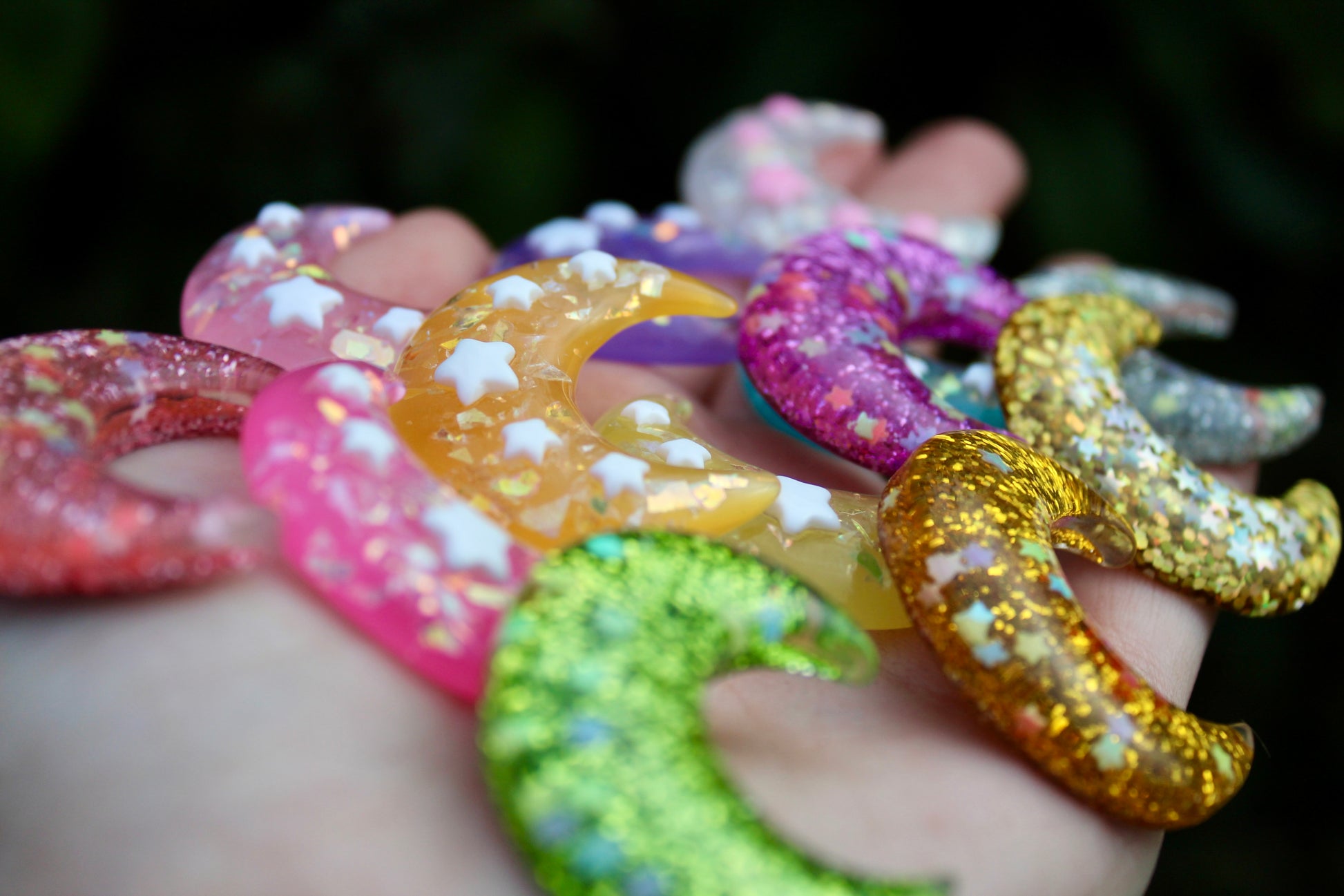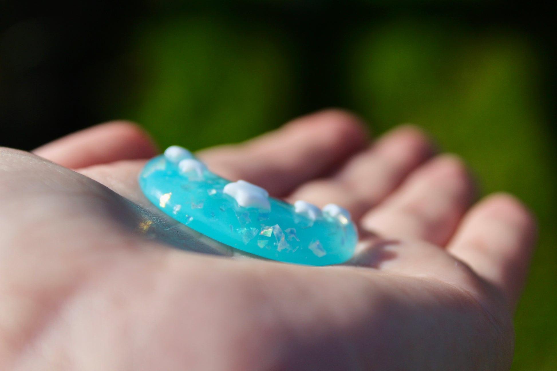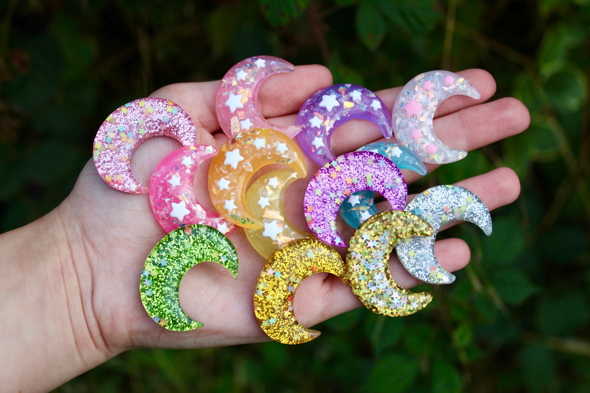 The moons are pocket sized and discreet (can be held in a closed palm). They are made out of semi-transparent resin and contain iridescent glitter which shines beautiful in the sun (a great visual stim). Ontop of the moons are white stars, these offer a great texture to trace with a thumb.