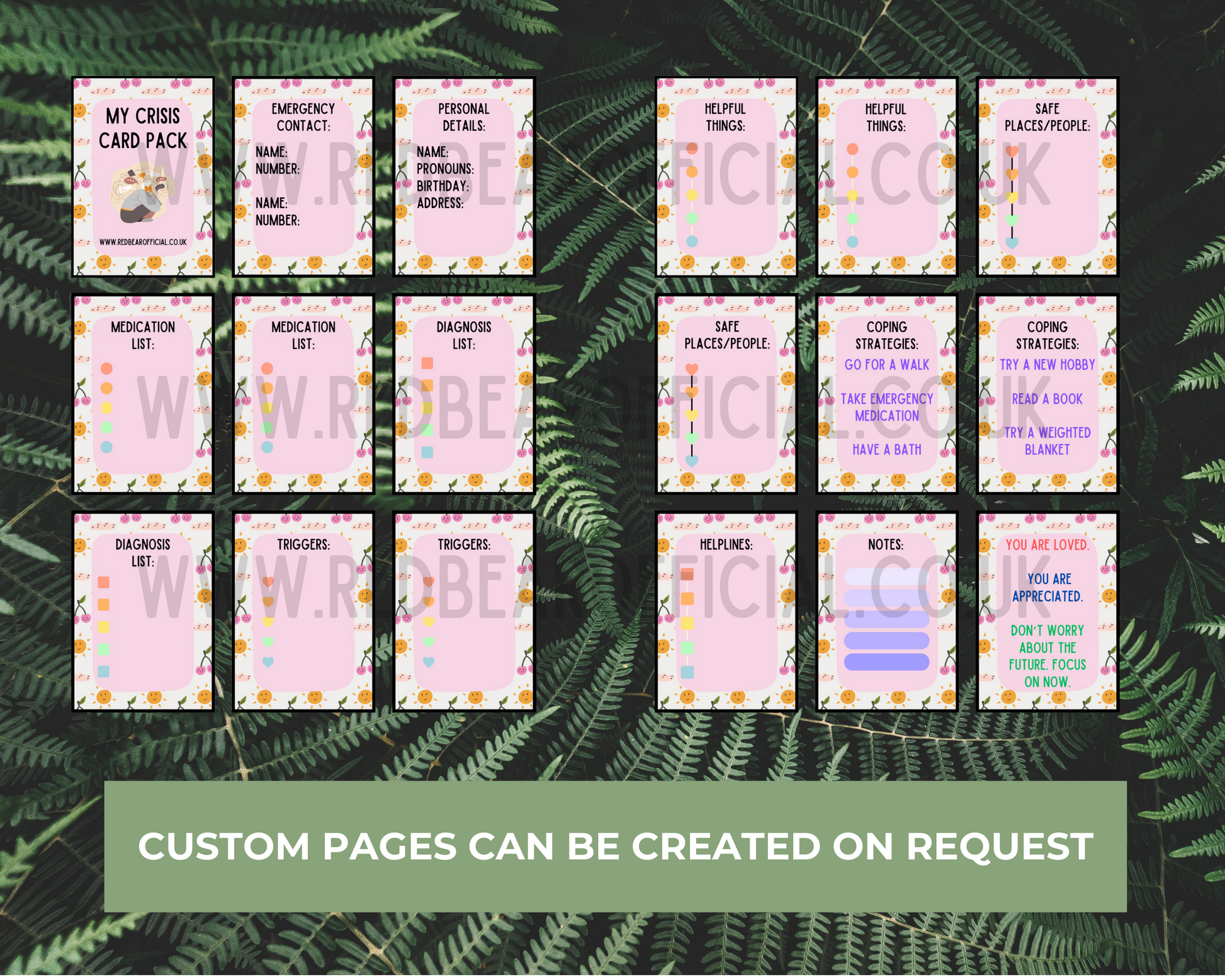 This digital download contains 18 different cards all directed towards helping a person during a crisis. Once purchased, you can print and download as many copies as you need. The digital download comes in A4 PDF format making. A printed and laminated version can be created at an additional cost, please message me for further details.