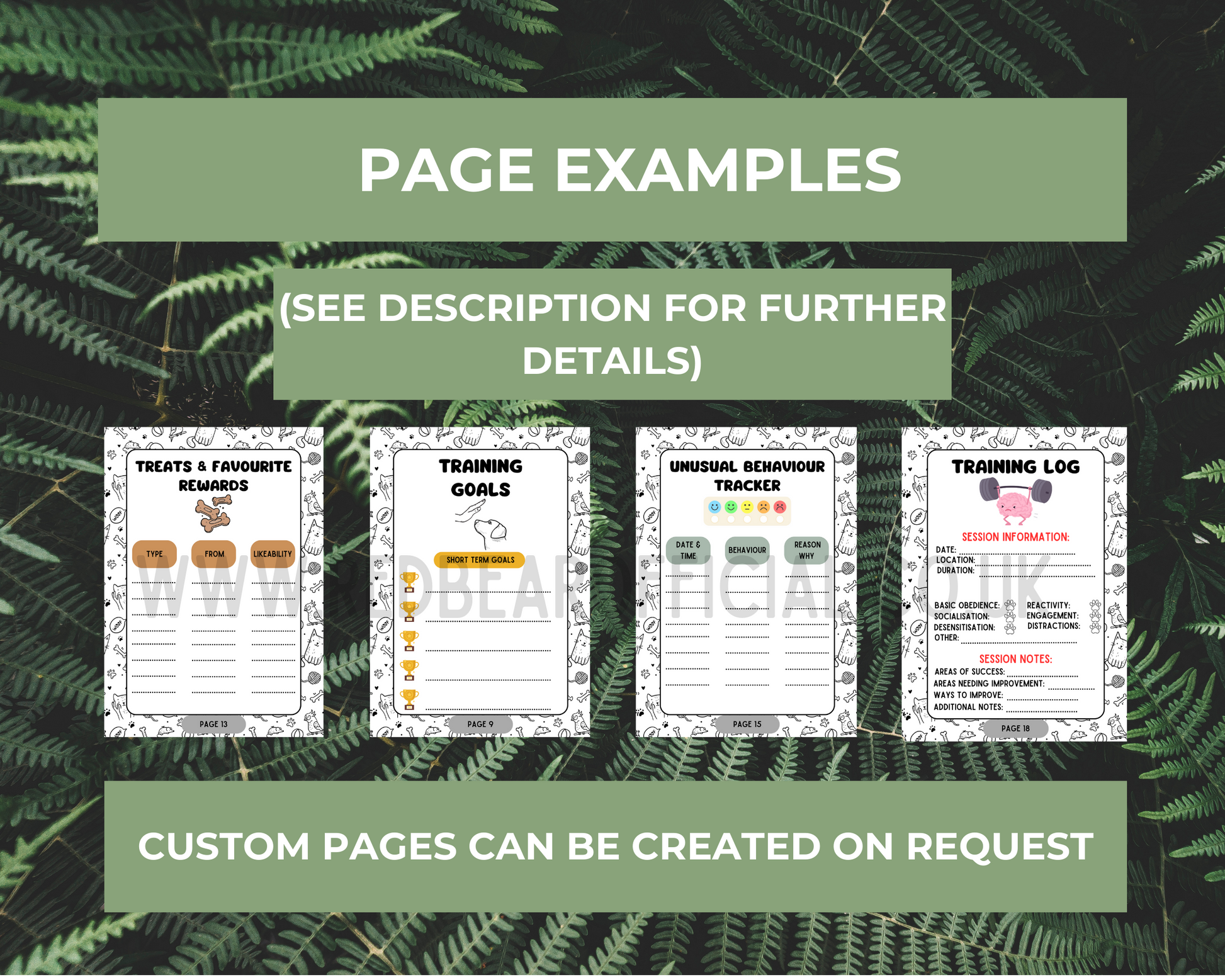 What is a reactive dog? Personal details, emergency information, dog's health log, general routine, pet sitter information, training goals, triggers, treats & favourite rewards, unusual behaviour tracker, training logs, reactivity tracker, positive things to remember, helpful resources and notes.