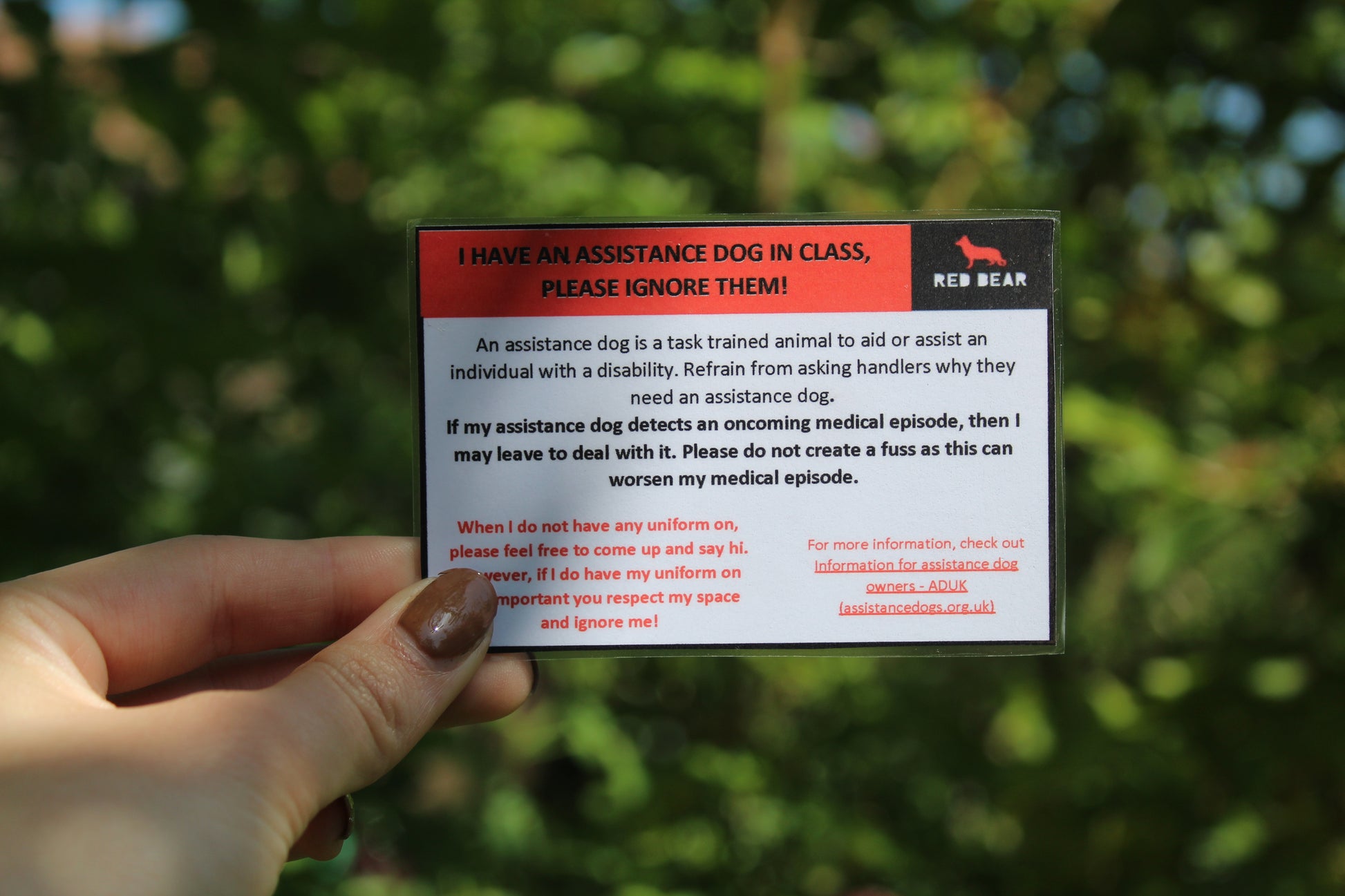 This "Working Dog in Class" card explains that the handler has a working dog accompanying them and that they may need to leave class to deal with a medical episode.